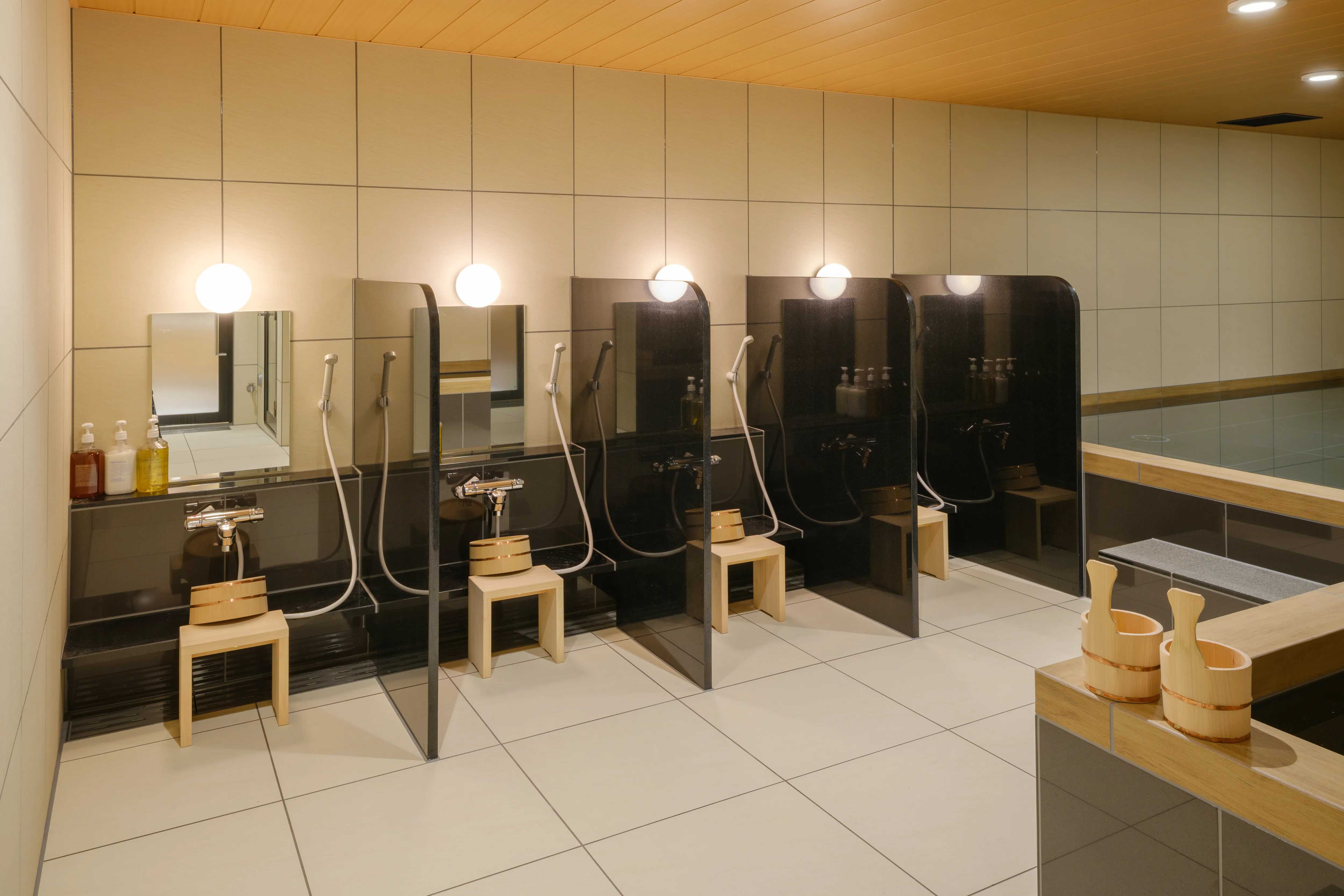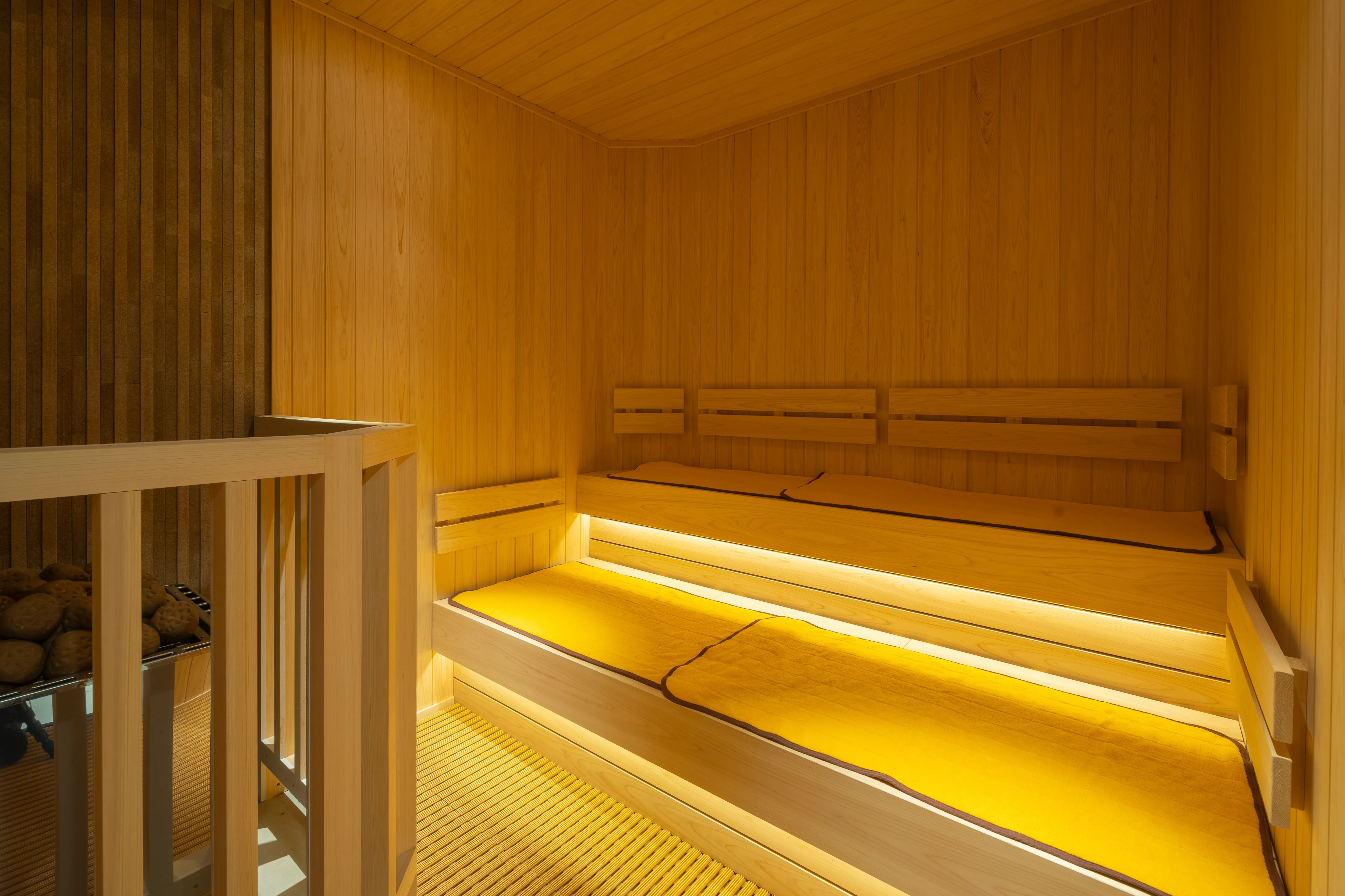 白湯・水風呂・サウナを完備し、移動や仕事の疲れをやさしく癒します。