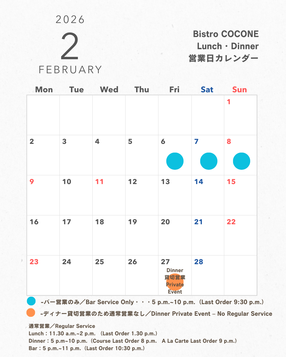 【Bistro COCONE】2月のランチ・ディナー営業スケジュールについて