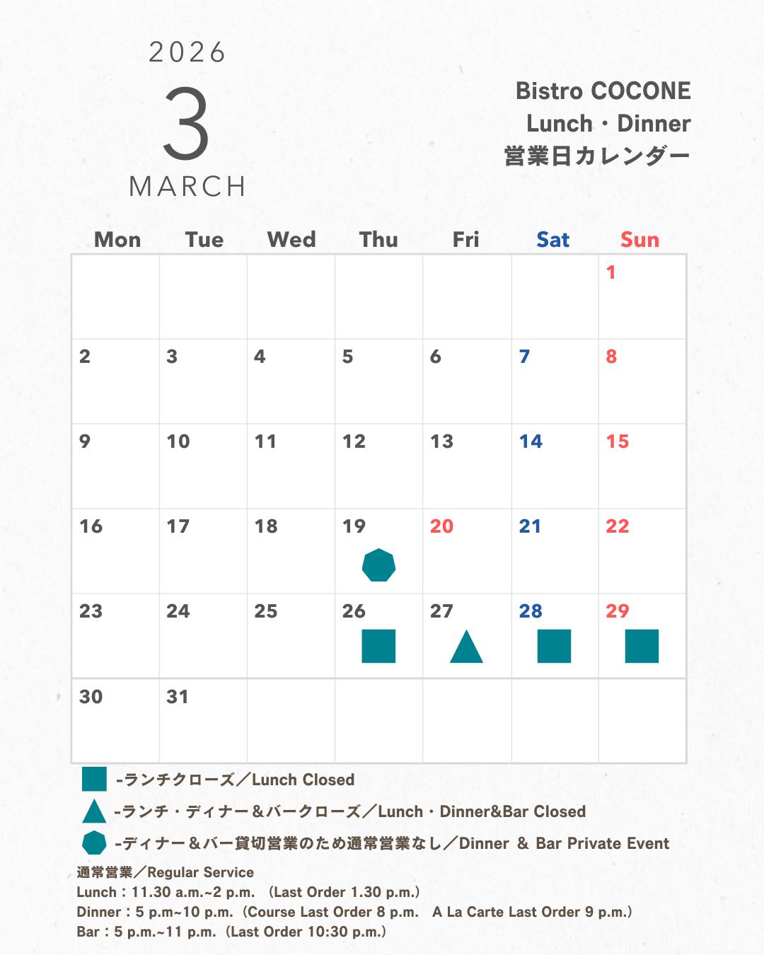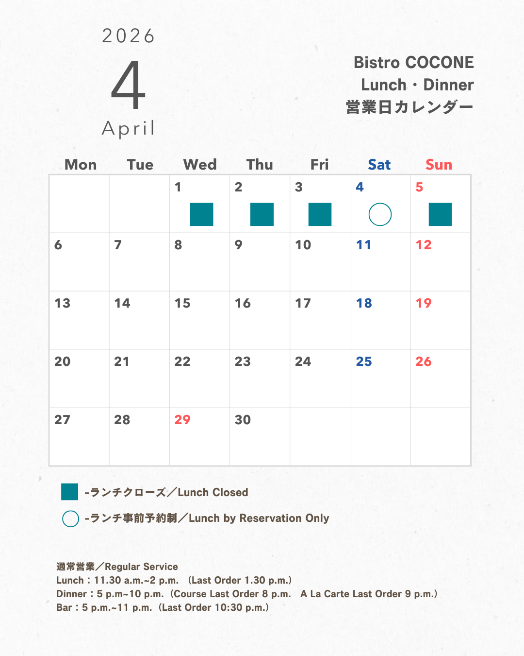 【Bistro COCONE】3月・4月のランチ・ディナー営業スケジュールについて